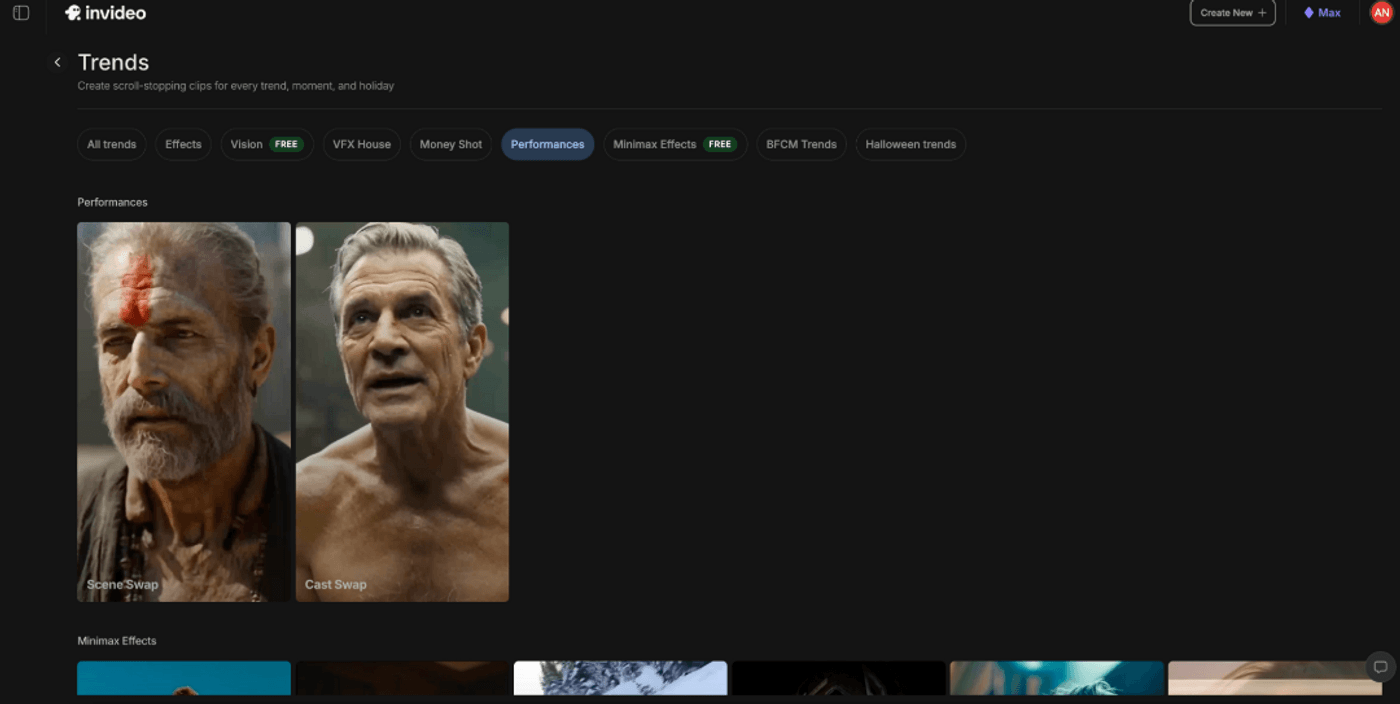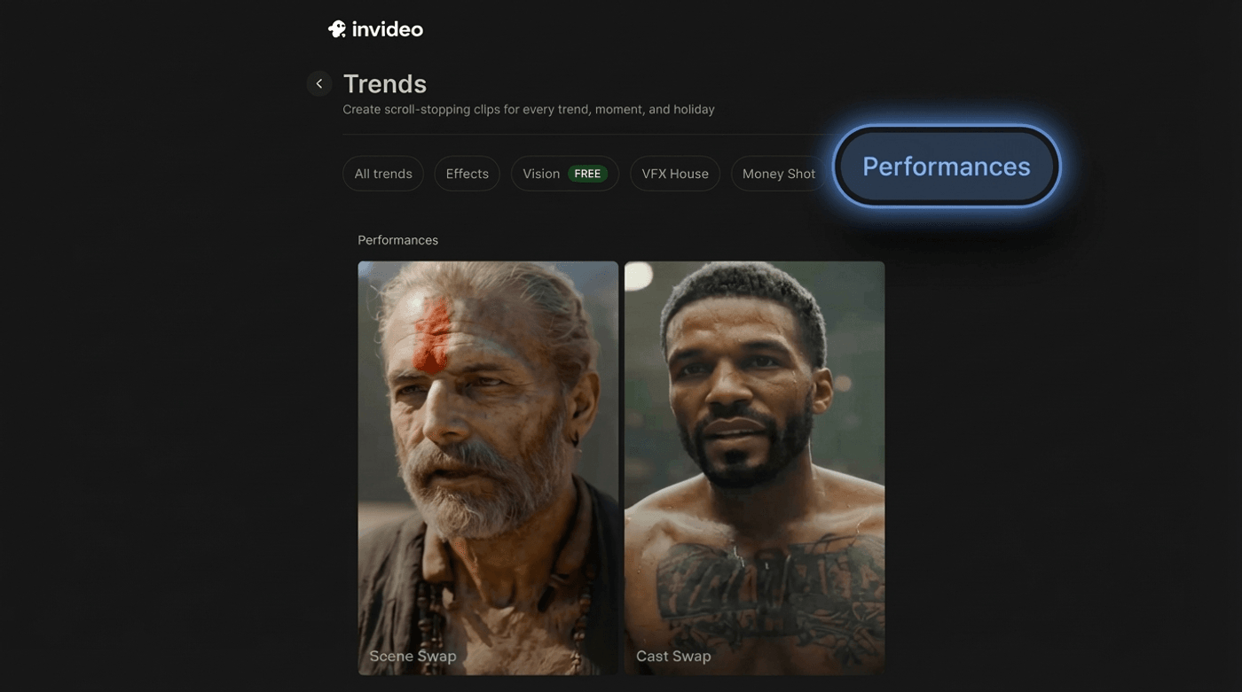 For realistic results rather than just novelty, invideo’s Performances workflow is one of the strongest options, and it is accessible from mobile as well as desktop. You can capture on your phone, then use invideo to do high-quality performance-based swaps that hold up for real campaigns.
