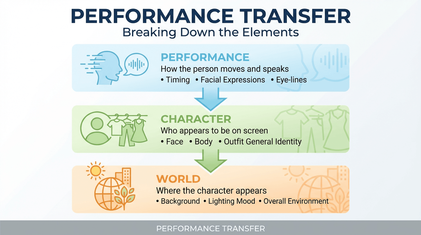 Scene Swap lets you keep your original performance and camera rhythm, and use a reference image to define a new character and world. The tool then animates that image with the performance signals from your driver video.
